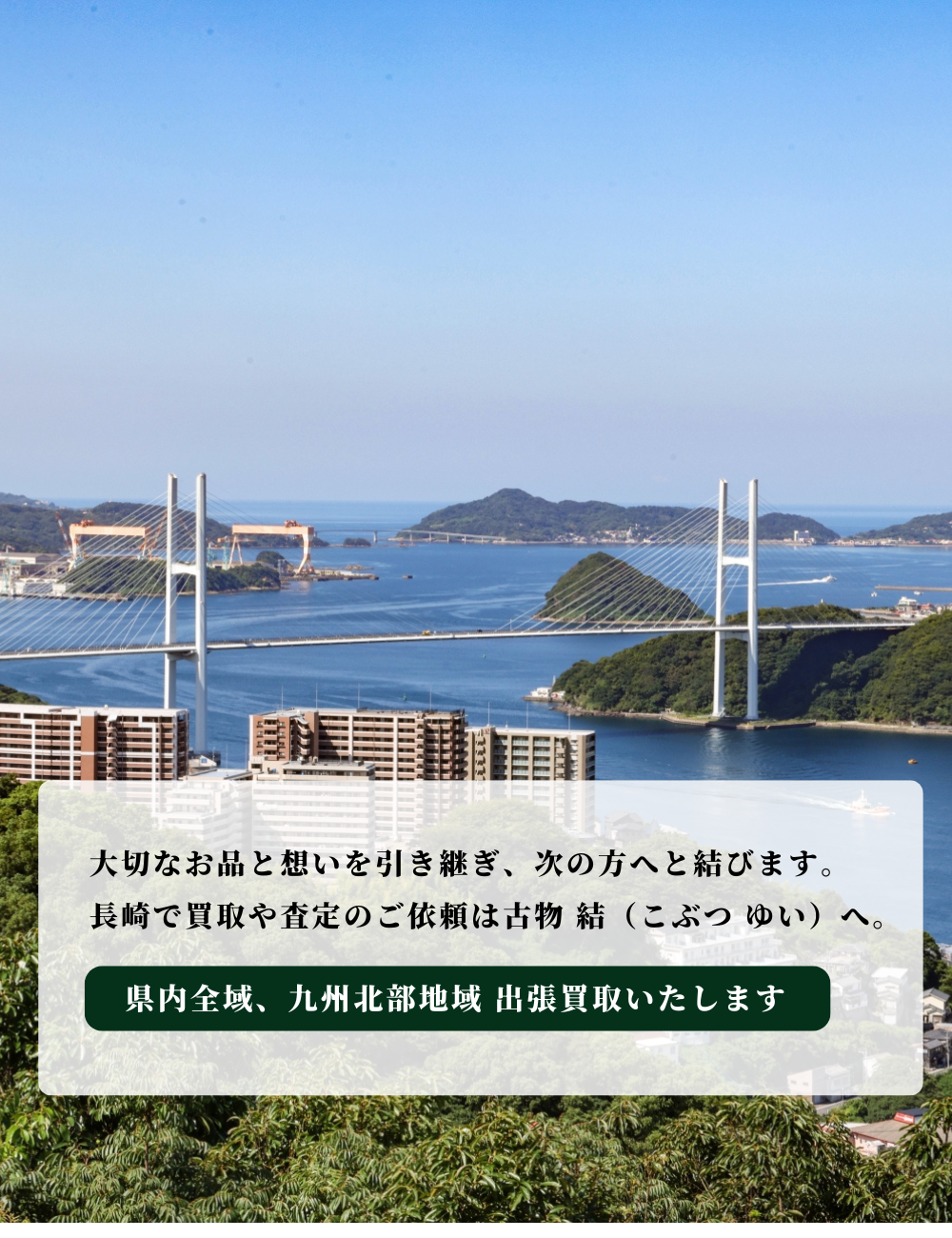 長崎を中心に、県内全域・九州北部エリアへ出張無料で伺います。遺品整理士(地区統括会員)在籍により、空き家の片付けや整理などのご相談もまとめて対応可能です。